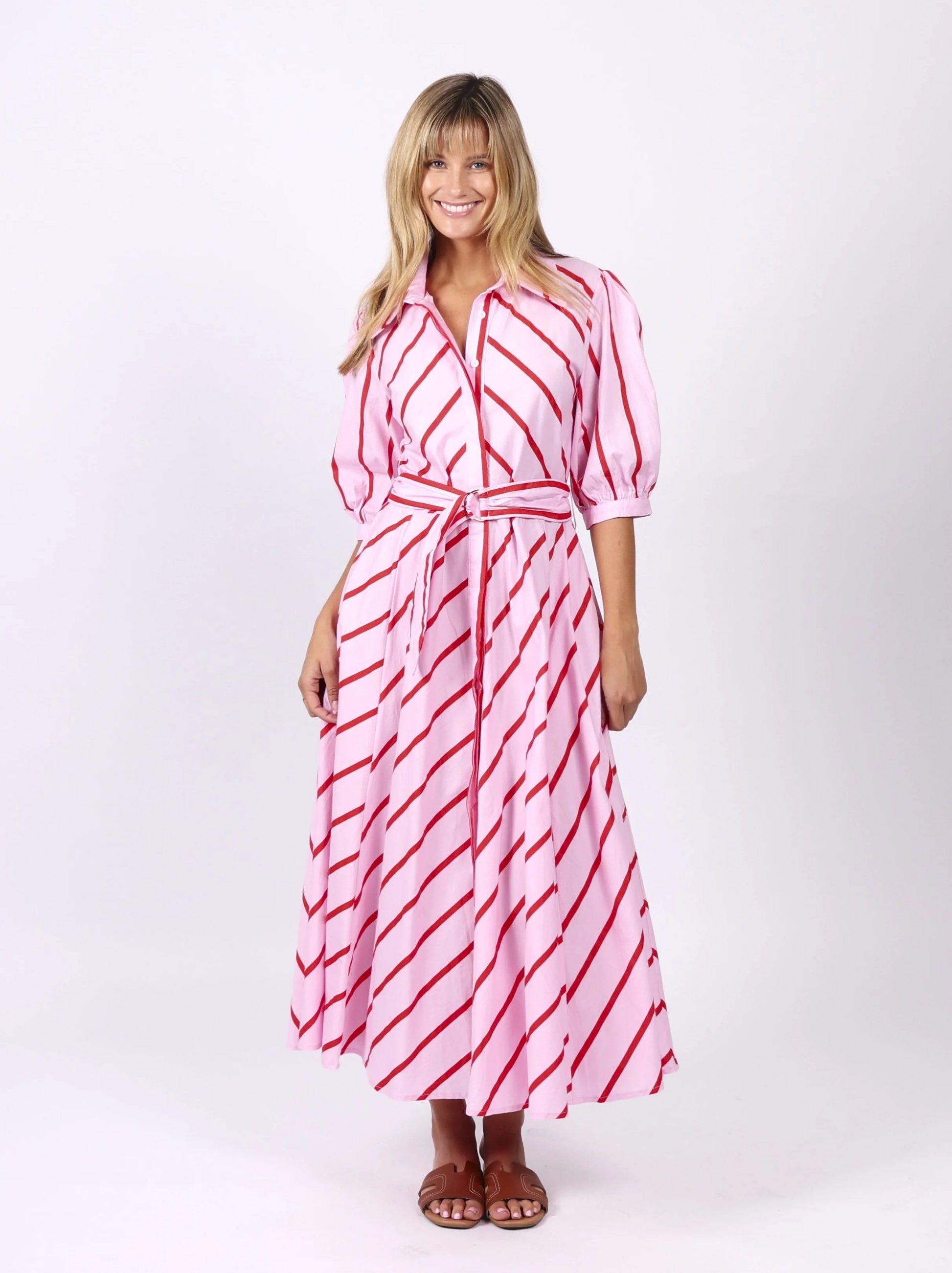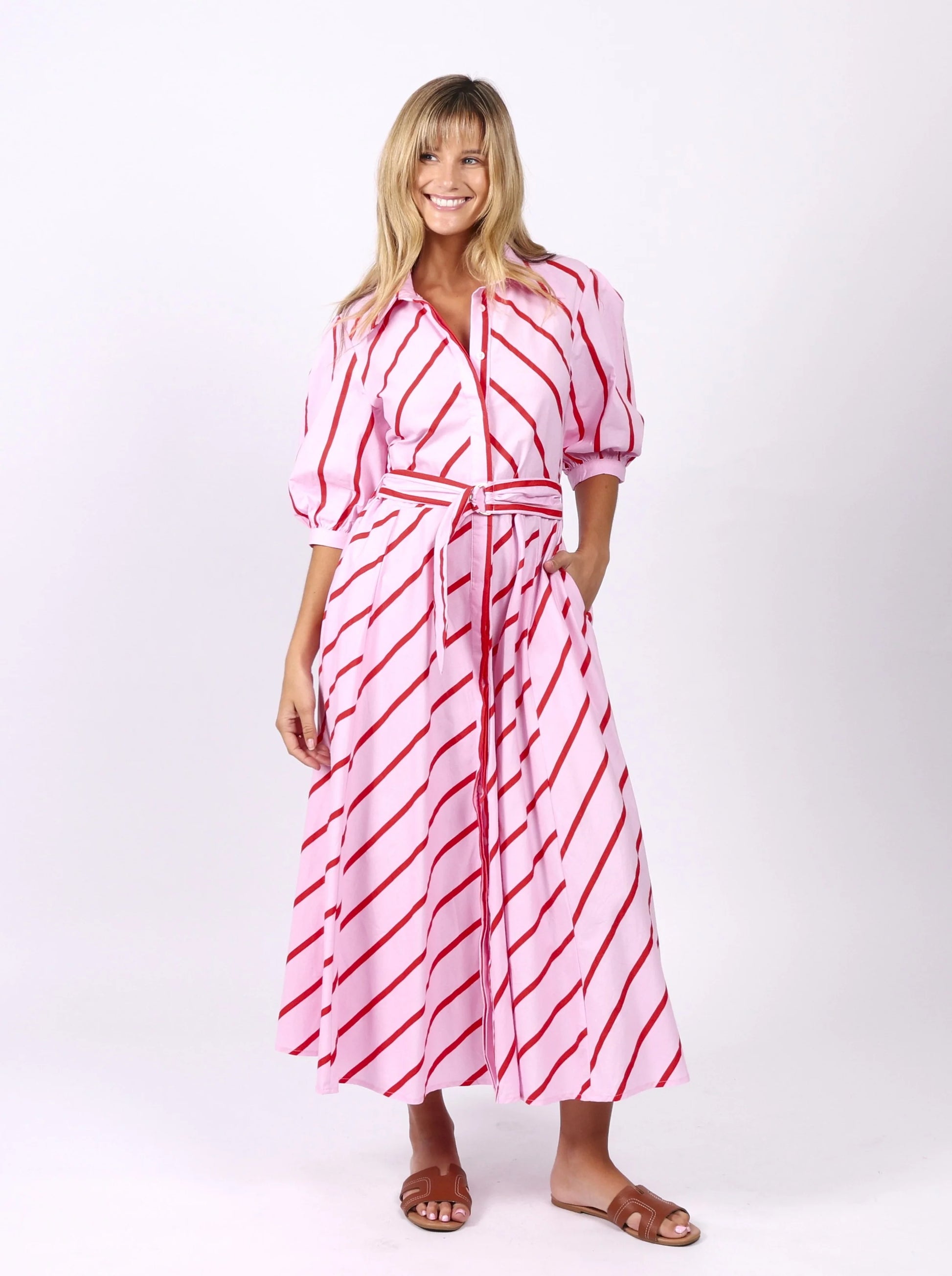 Yarn-dyed stripes enhance the preppy aesthetic of this pure cotton shirtdress, which is designed in an A-line silhouette, relaxed bodice with a flared skirt and finished with our signature elbow-length pleated balloon sleeves. A removable matching belt allows for versatility in styling and waist definition.