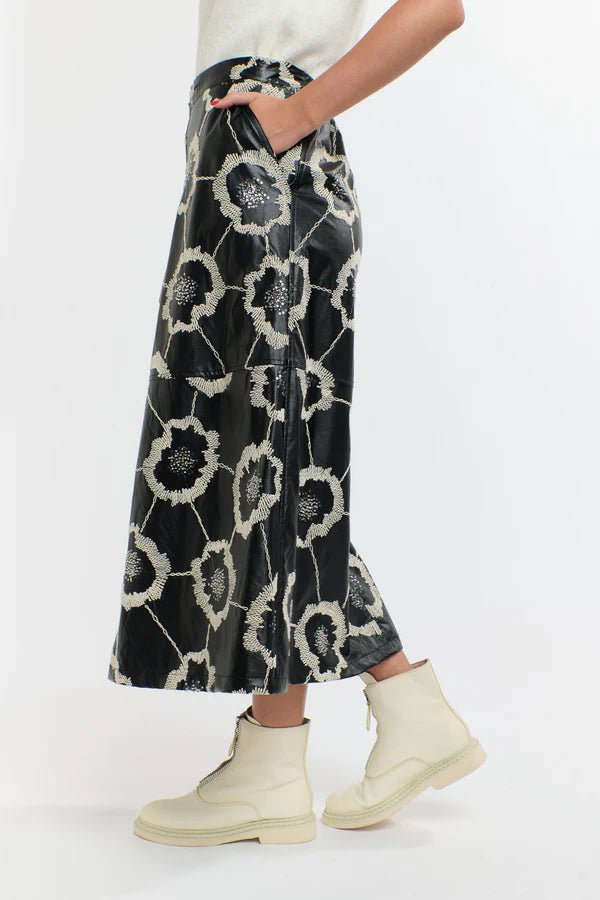 Statement-making yet wearable, the Florence PU Skirt brings polish to everyday dressing. The wide A-line cut creates natural volume and ease, while the bold graphic motif adds texture and visual impact. Pair with a pared-back knit or shirt to keep the look grounded and balanced.