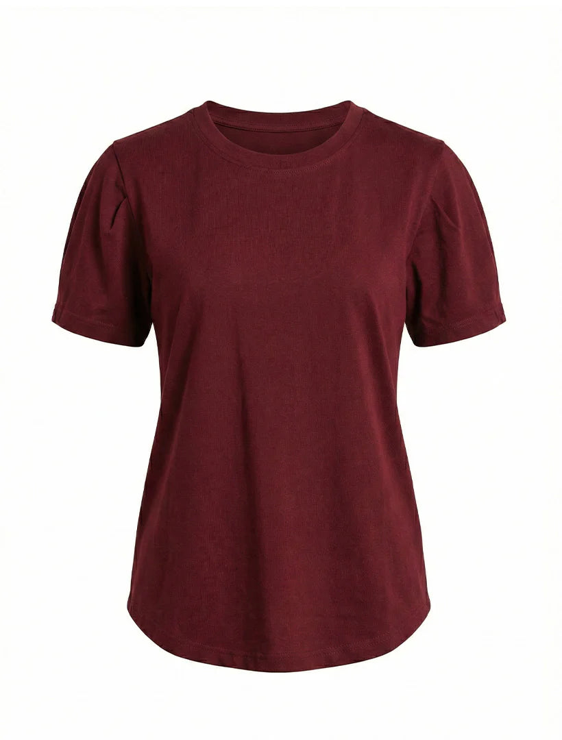 Lauren Tee is a soft, short-sleeved t-shirt in a deep, dark reddish-purple color. The fabric is made of smooth cotton that feels lightweight and has a gentle stretch, fitting comfortably against the body. It features a simple, round neckline that sits at the base of the neck.