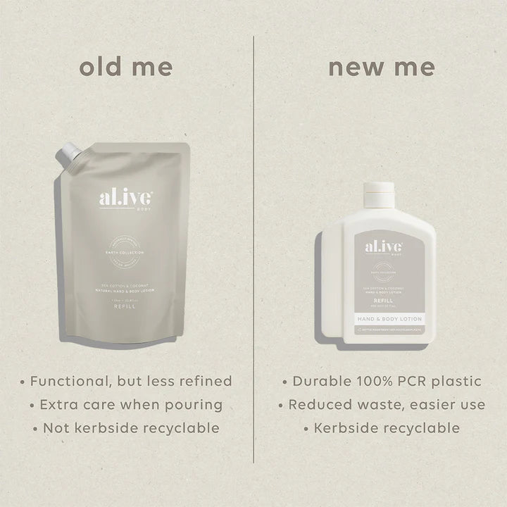 Each refill is designed to refill the 500ml al.ive body Hand & Body Lotion bottle, with a little to spare. With a controlled-flow spout for mess-free pouring, a compact shape for easy storage, and full kerbside recyclability, it offers a practical, premium solution that extends the life of the product you already love.