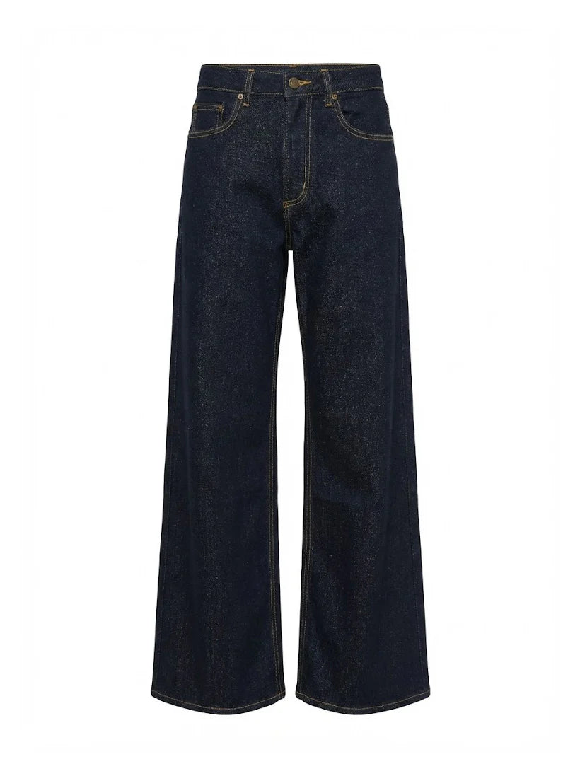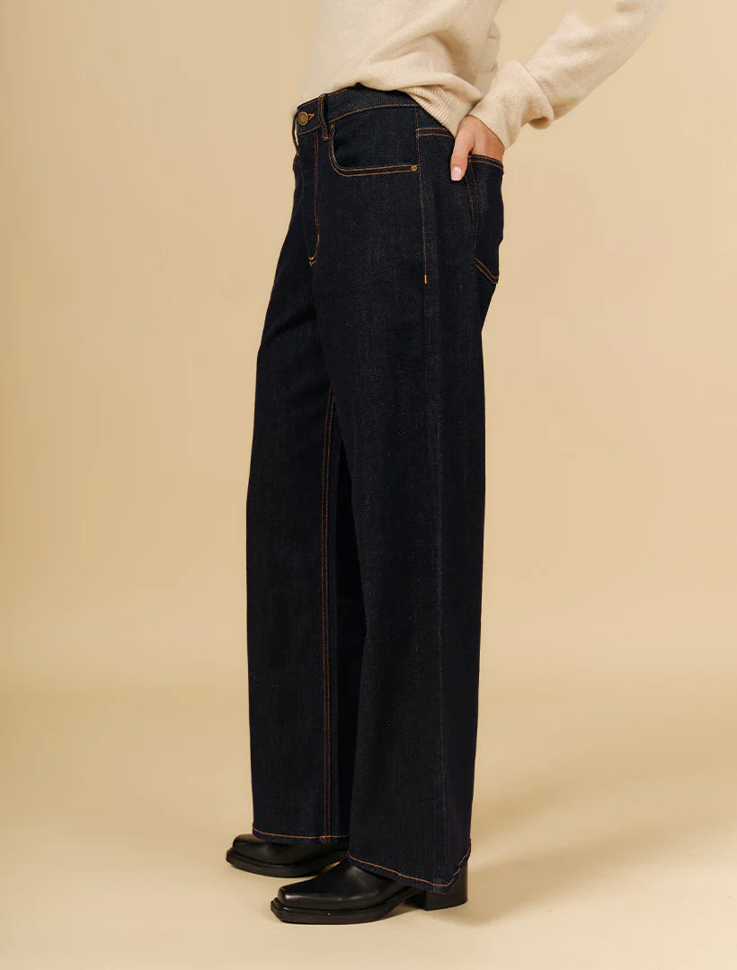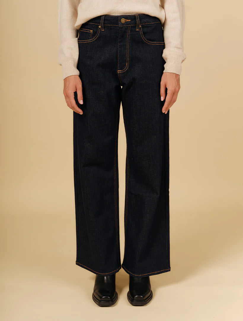 The Paige Jean is a polished, high-waisted straight-leg jean in a deep ink wash. It offers a relaxed yet structured fit that creates a clean, elongated line from the waist to the ankle. Key features include a zip-fly, a small coin pocket, and classic golden-brown stitching for a high-quality finish.