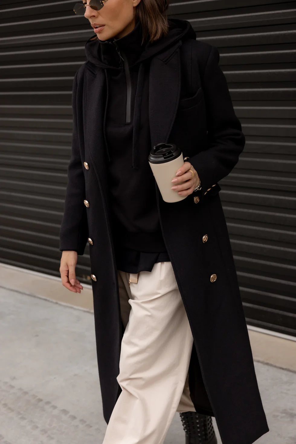 Command attention in the RUSSIAN Coat, a refined take on the classic officer silhouette. Crafted from a premium wool blend, this double-breasted longline coat exudes strength and sophistication. Statement gold buttons with custom embossing add a regal touch, while the sharp pressed collar and structured silhouette enhance its polished appeal. Designed with subtle shoulder pads for added definition and fully lined for a smooth finish, this coat is the ultimate power piece for timeless elegance.